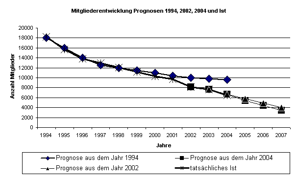 Entsprechend der Mitgliederdatei waren am Ende des Jahres 2004 6.434 Mitglieder organisiert. Für die Prognose der Entwicklung der Finanzen wird von folgenden Mitgliederzahlen ausgegangen.